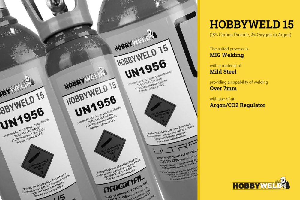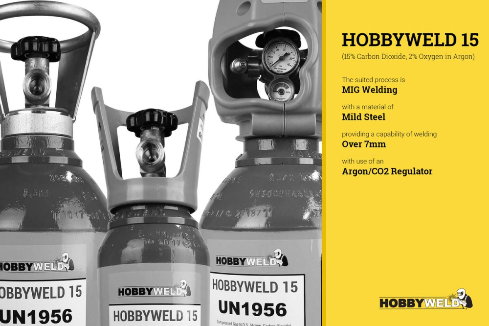The Hobbyweld 15 Original (Small) cylinder is a compact 9 litre, rent free shielding gas cylinder designed for MIG welding medium to thicker mild and carbon steel. Filled with the proven Hobbyweld 15 blend of 83% argon, 15% CO2 and 2% oxygen, it delivers deeper penetration, a stable arc and reduced spatter, making it ideal for fabrication, structural work, automotive repair and agricultural engineering.